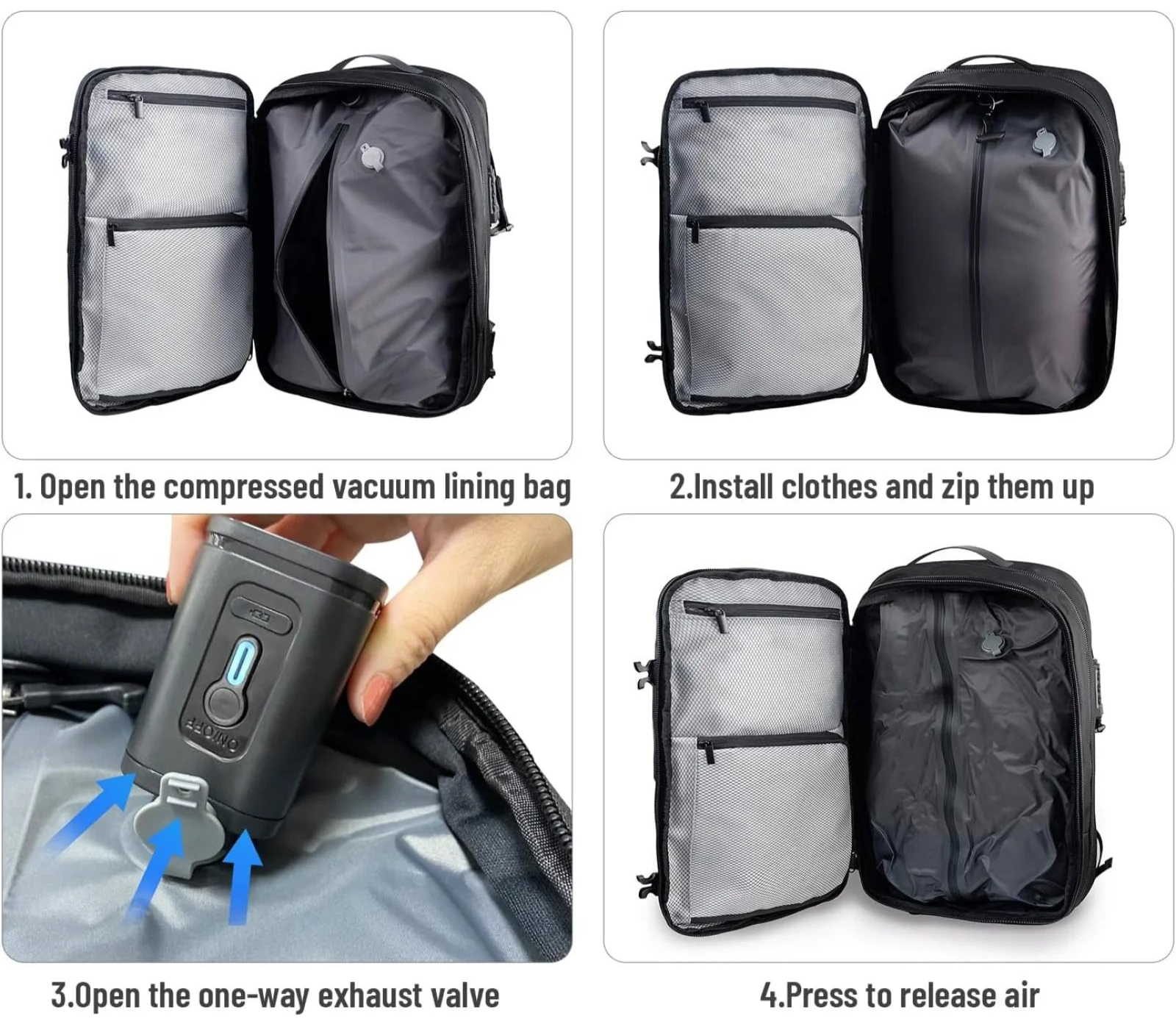 The vacuum sealing technology in our backpack uses a compression system that removes air from the bag's interior, allowing you to compress your belongings and save space.